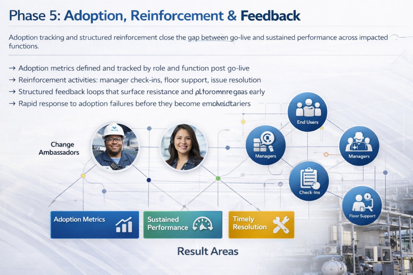 Adoption tracking and structured reinforcement close the gap between go-live and sustained performance across impacted functions.