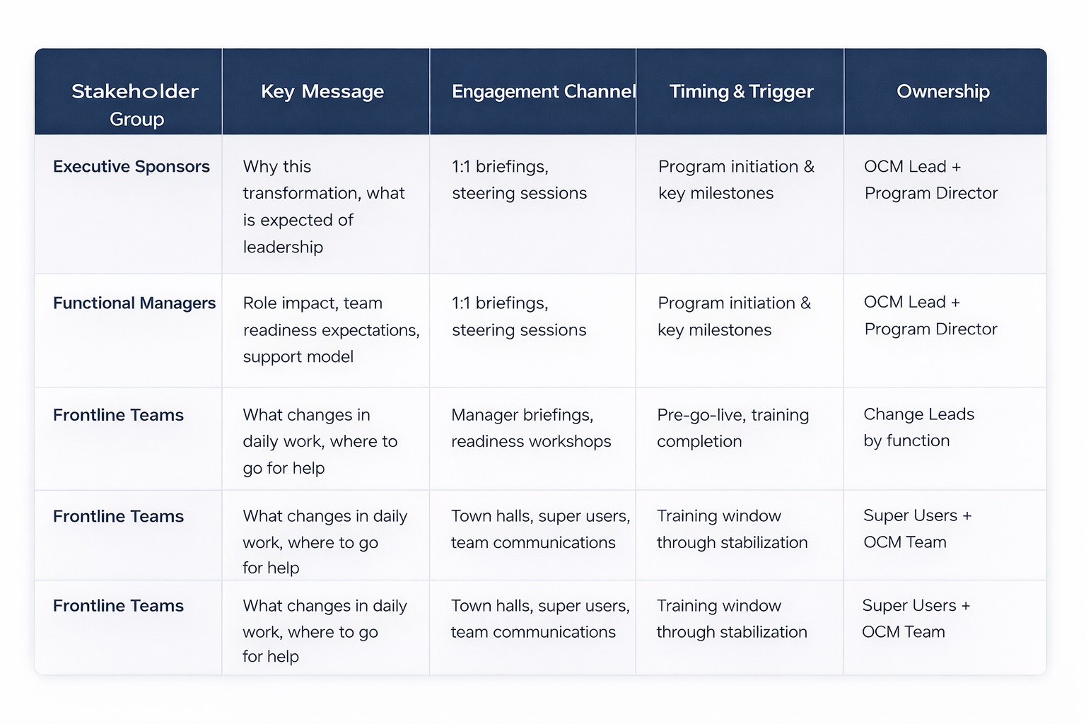 Change communications move stakeholders from awareness to commitment through role-based messaging tied directly to transformation milestones.