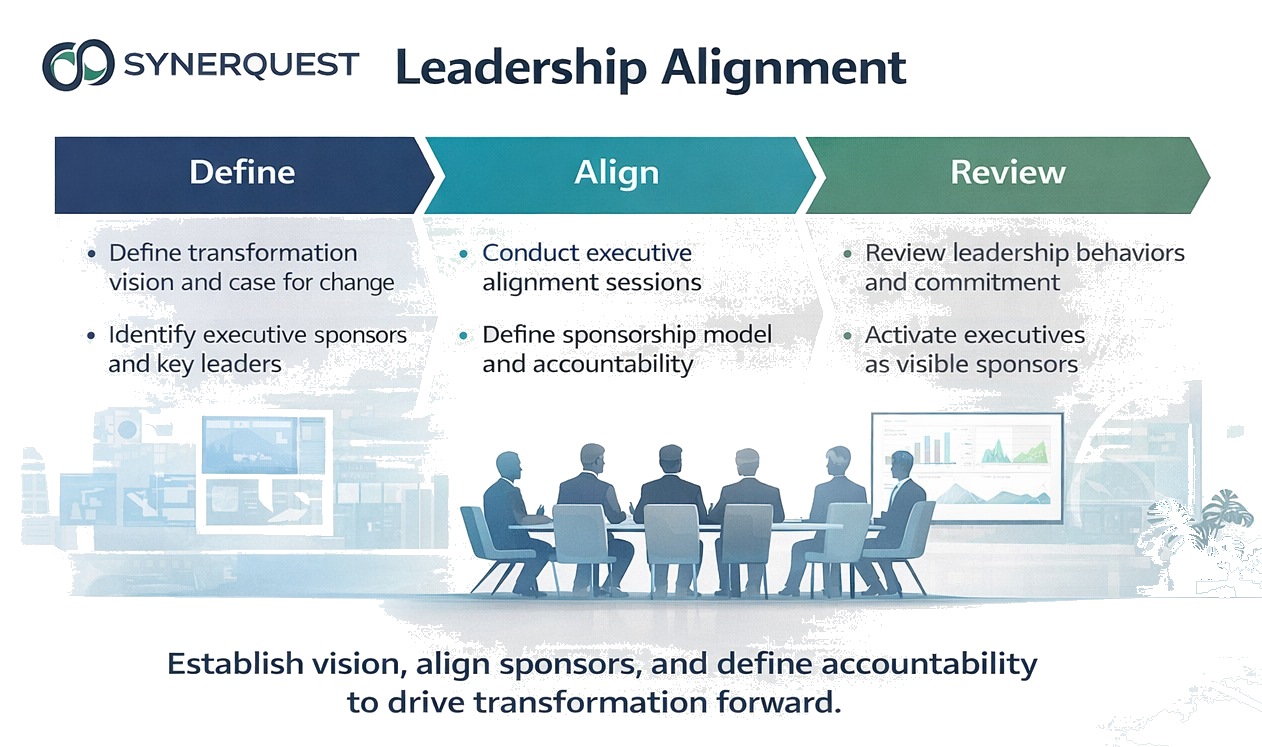 Executive alignment is the foundation of transformation execution. Sponsors are activated, accountability is defined, and visible commitment is sustained across delivery.