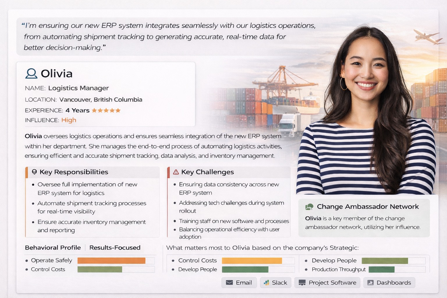 Effective change leadership starts with understanding how transformation affects the people doing the work. Stakeholder personas like this one are built from real engagement — informing communications, training design, and adoption strategy at the role level.