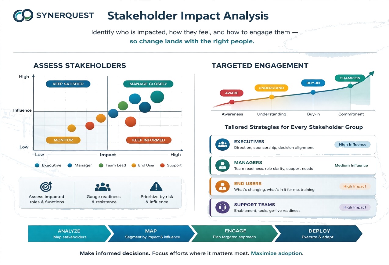 A structured stakeholder assessment identifies who is affected, how their work is changing, and where adoption risk requires early intervention.