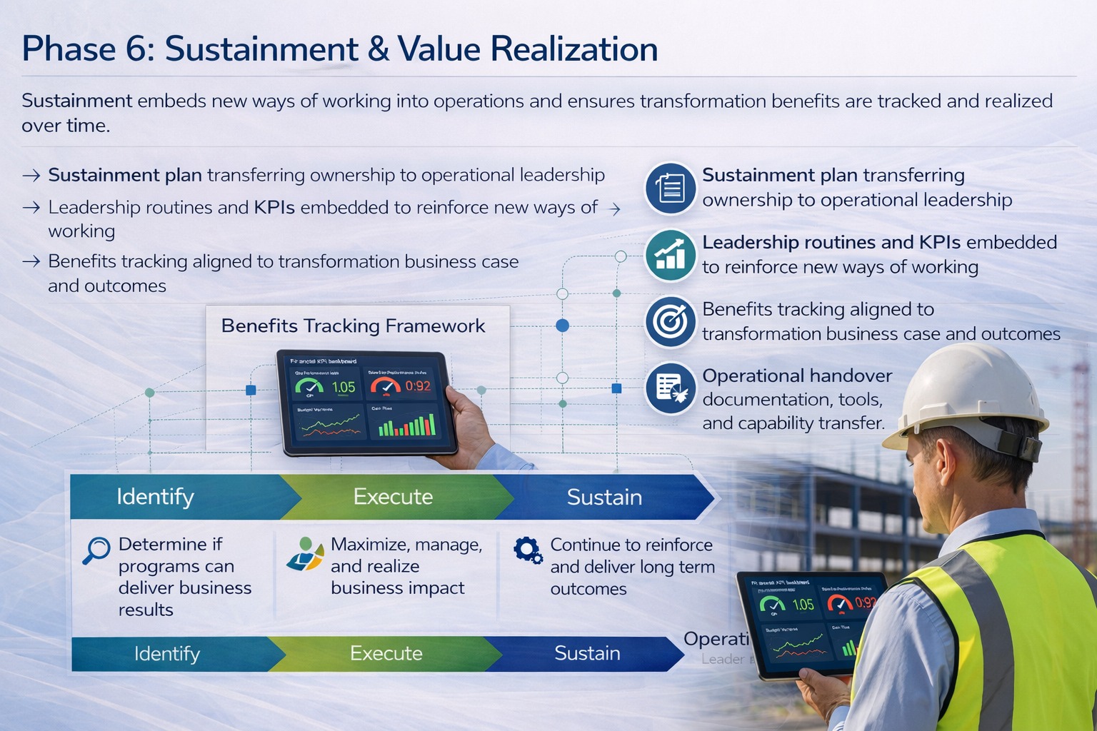 Sustainment embeds new ways of working into operations and ensures transformation benefits are tracked and realized over time.