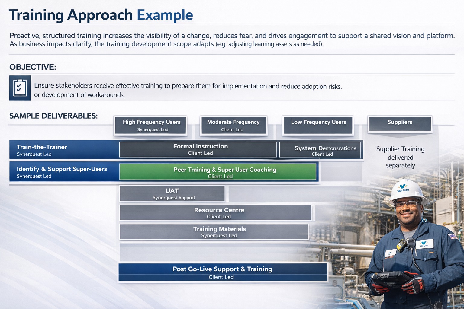 Role-based training and readiness activities prepare impacted teams before go-live and sustain capability through stabilization.
